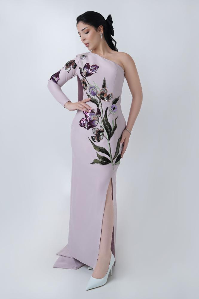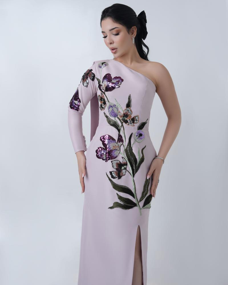 فستان ون شولدر بذيل من قماش التفته بتطريز يدوي راقي وفخم وبألوان مميزة وملفته