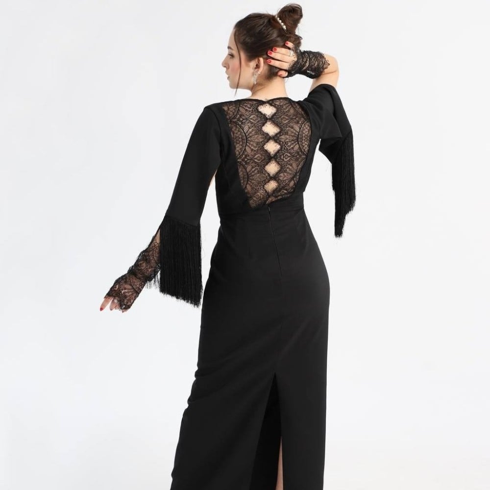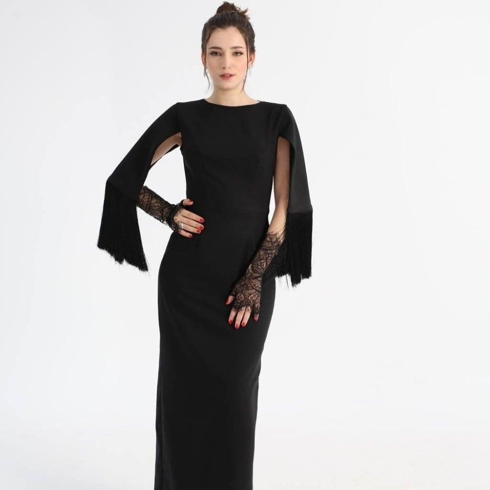 فستان كيب من قماش الكريب بهدب وقصه ظهر جذابة من قماش الدانتيل الفرنسي