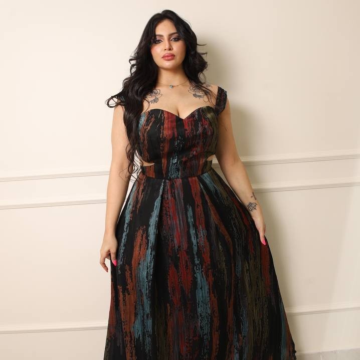 فستان سهره بقصه جذابه من الحرير الأسود الفخم الممزوج بألوان مميزه وملفته